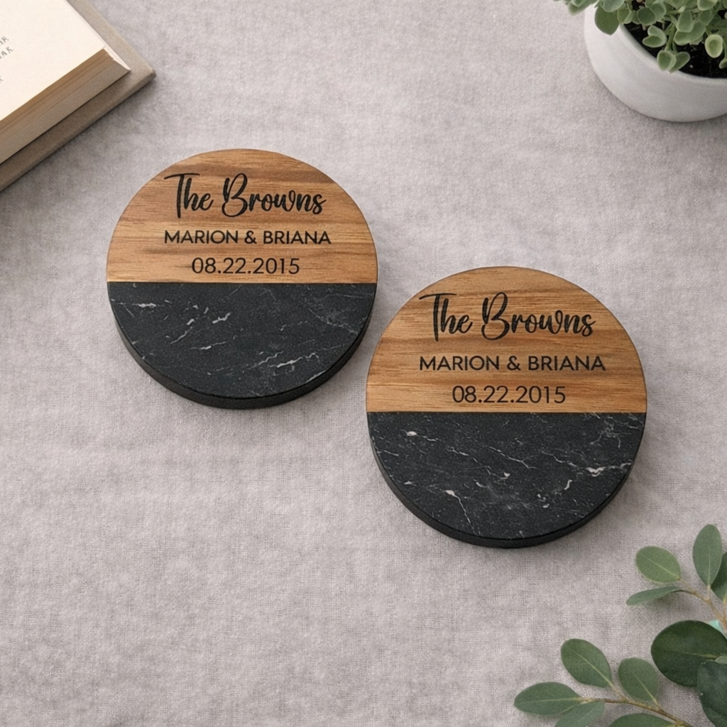 Personalized Marble + Wood Coasters - Circle